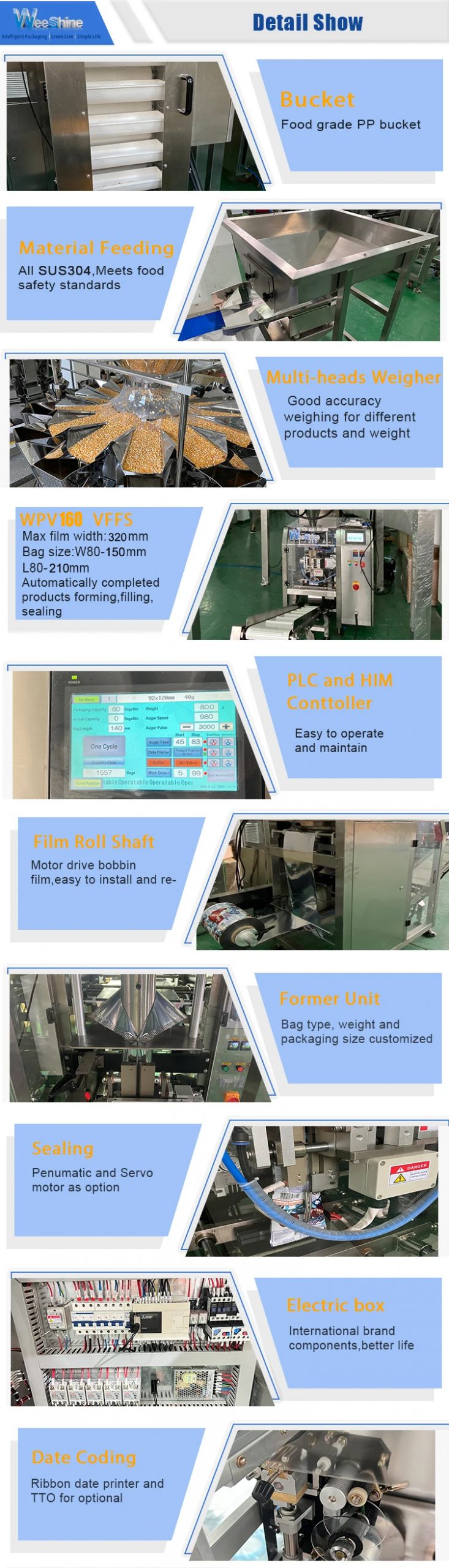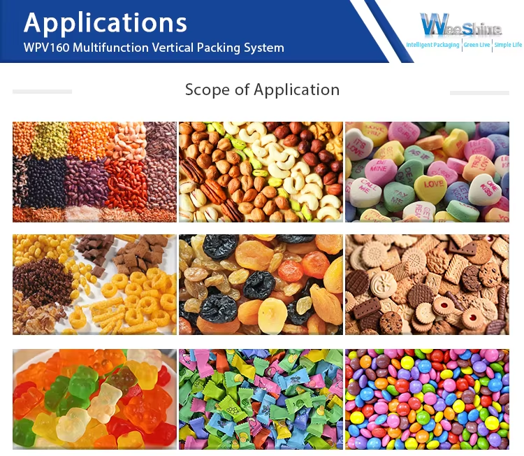 Weeshine WPV160 is an fully automatic vertical packaging machine, for the production of a very wide range of package. Its features are speed, flexibility and ultra high quality of materials. It is a high ranging machine in its category, able to make up to 80 packages per minute. With a broad range of applications and suitable for resolving complex problems, it is easy to use, thanks to its simplicity and mechanical sturdiness and to higher level electronics.