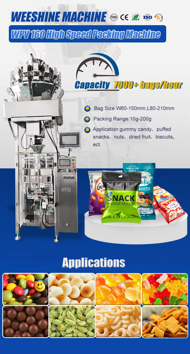 Weeshine WPV160H high-speed packaging machine is a top-performing automated solution designed for rapid and efficient product packaging. It is ideal for a variety of granular products such as nuts, grains, candies, and seeds, capable of completing large volumes of packaging tasks in minimal time.