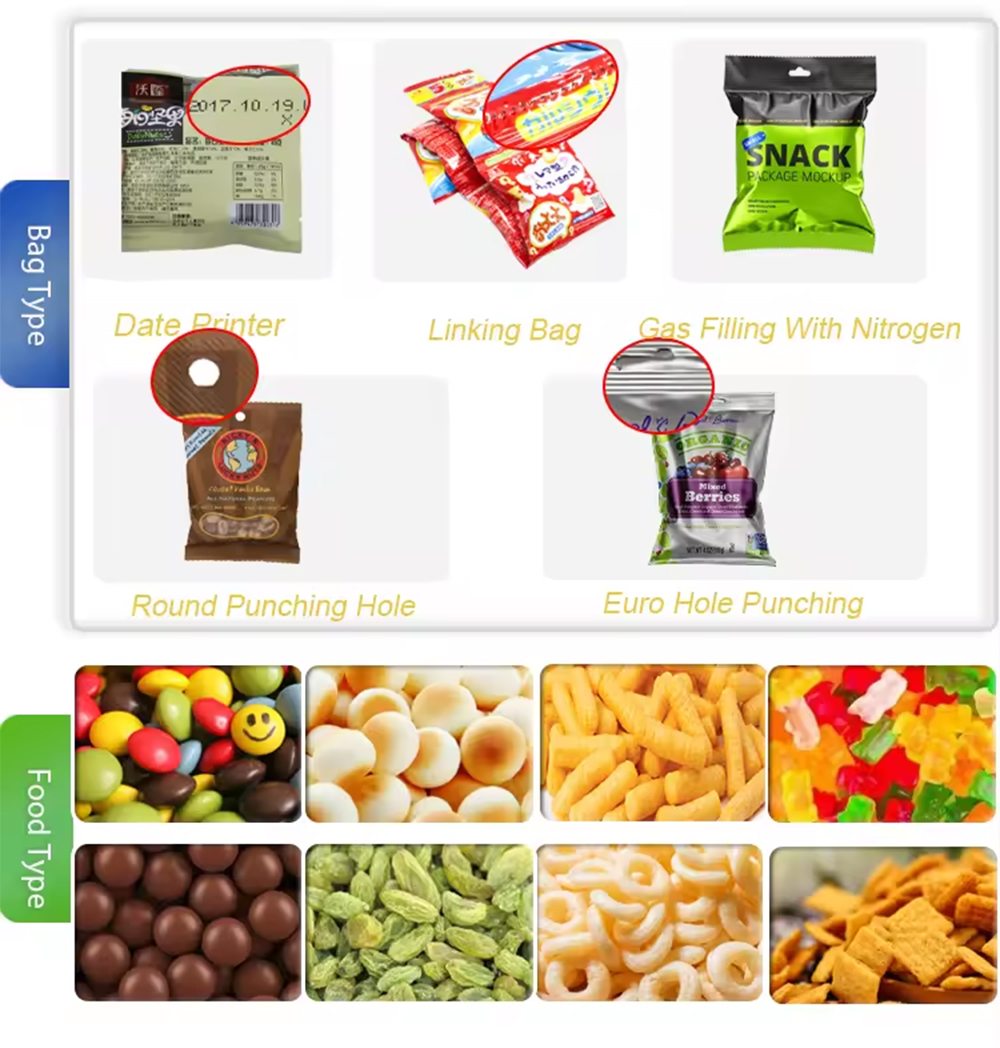 - Versatile Bag Support: Compatible with multiple bag types, including pillow bags, stand-up pouches, and four-side seal bags, meeting diverse packaging needs.